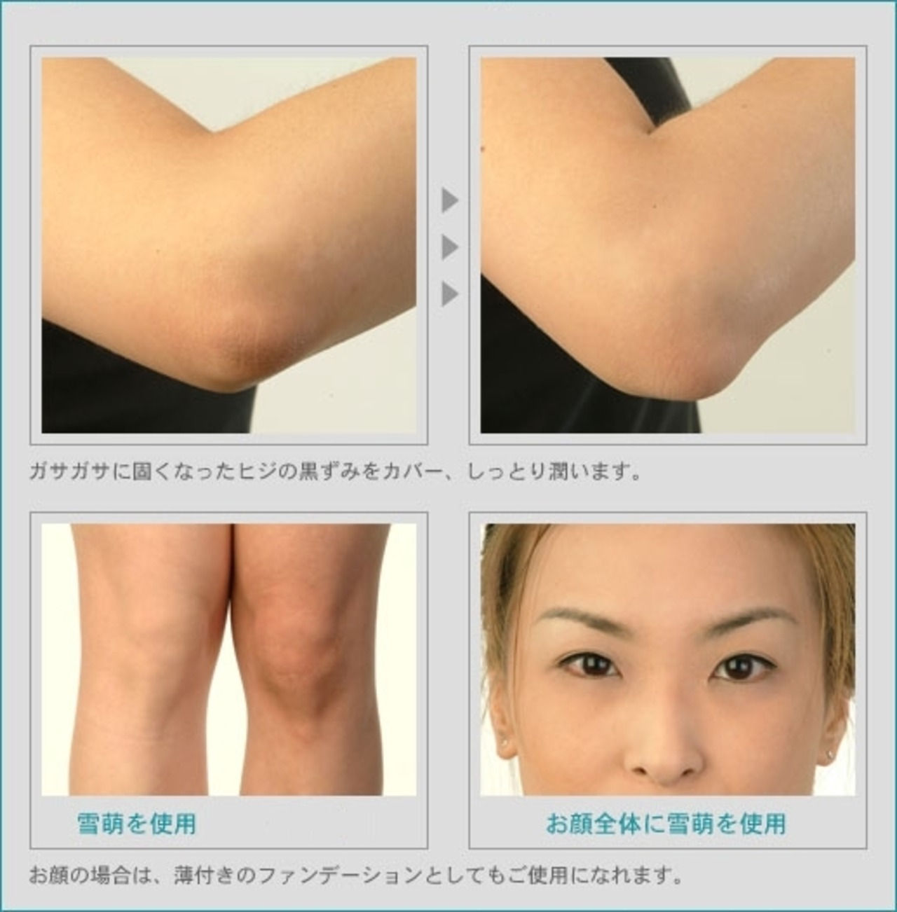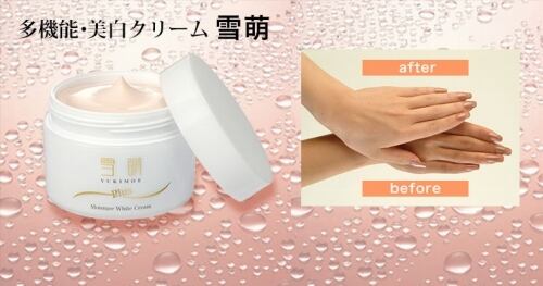 ≪雪萌(ゆきもえ)美白モイスチャークリーム≫は、シミ・くすみ・日焼け等の目立つ部分を、使った直後から白肌にカバーし、継続してご使用されると、美白成分配合の効果で、徐々に地肌も肌本来の白さへと導きます。